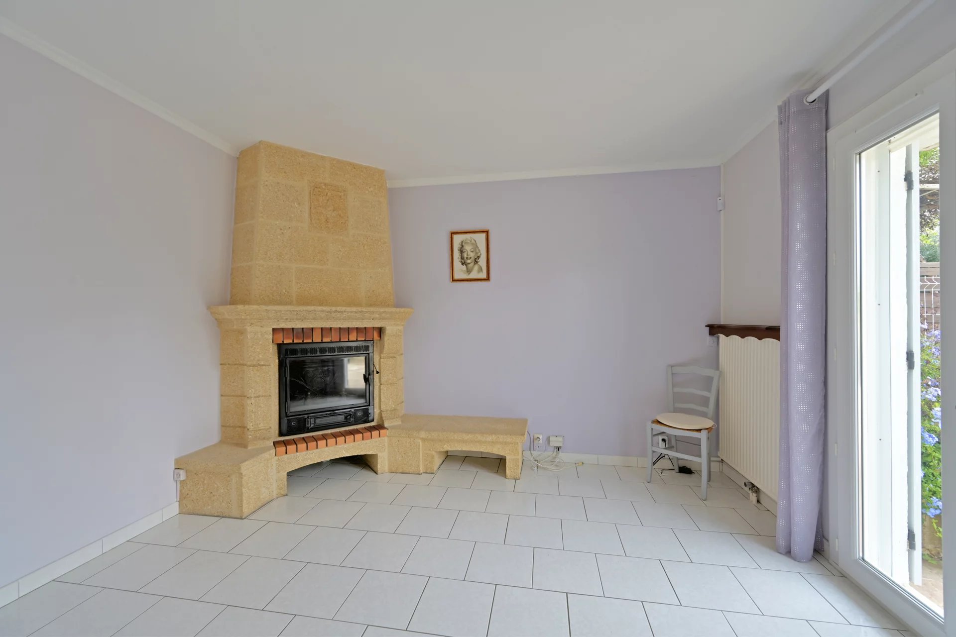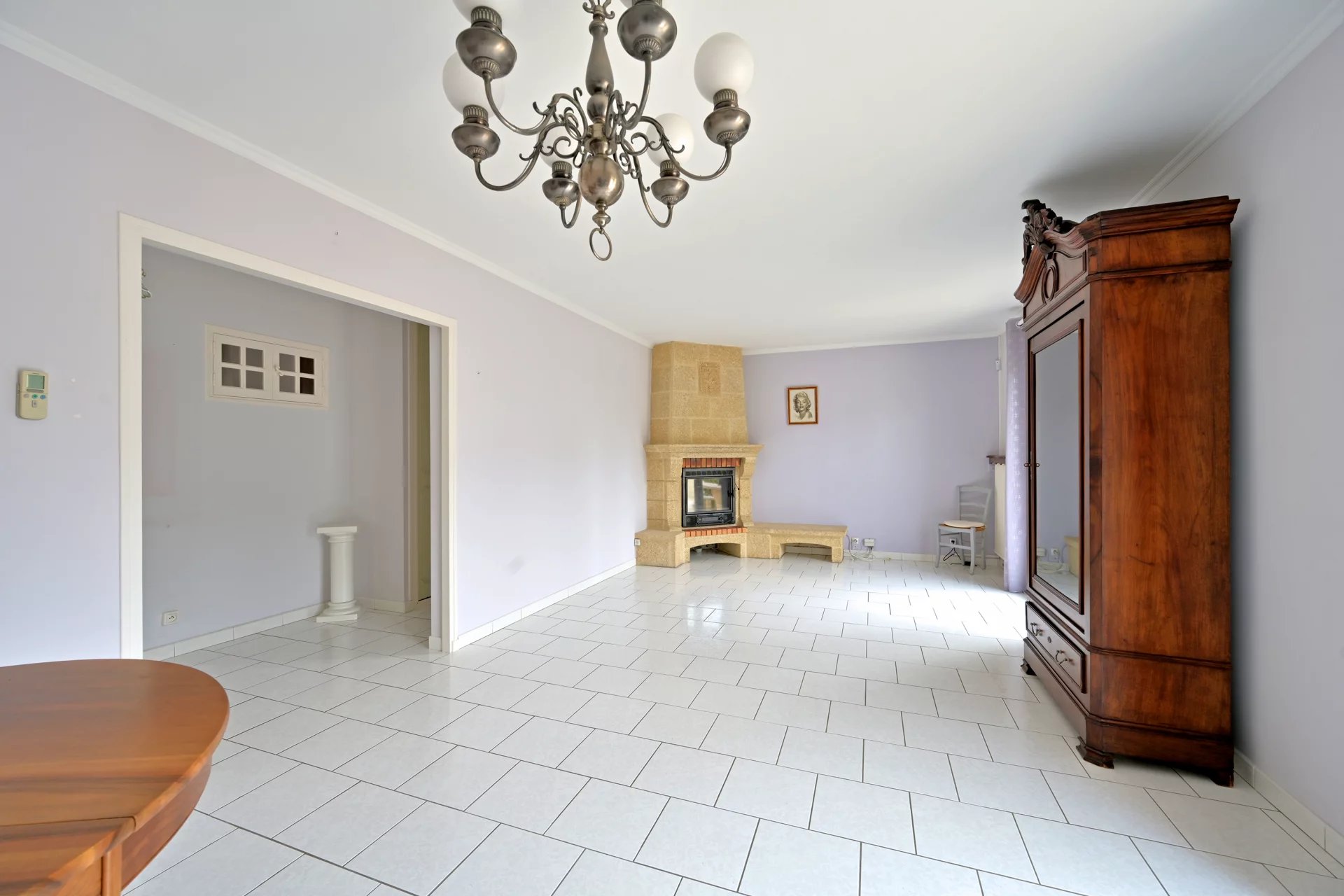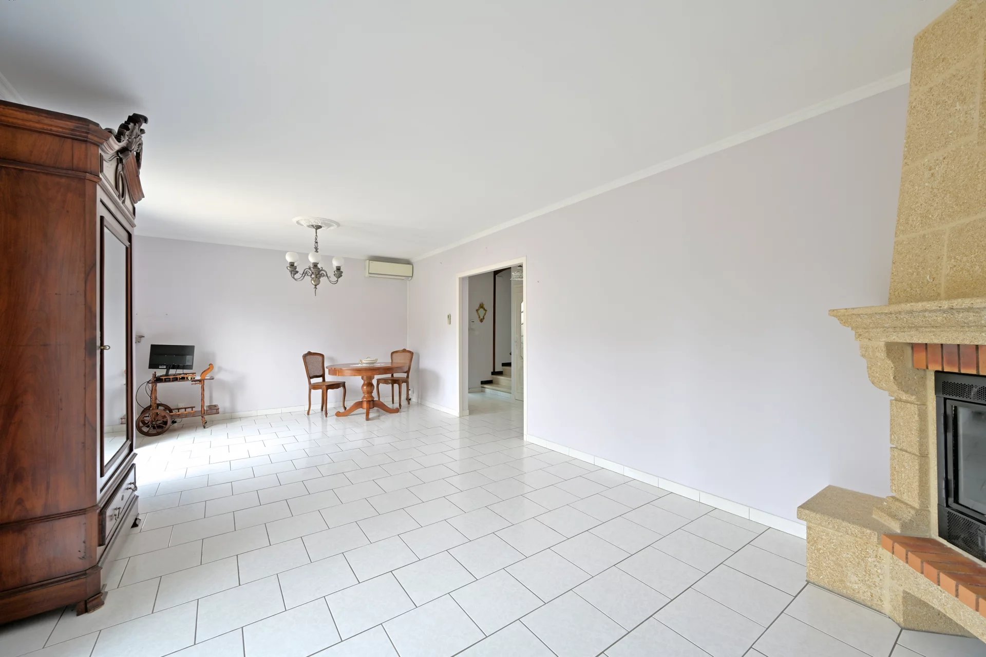 Le rez-de-chaussée comprend un séjour lumineux de 27 m² avec cheminée et climatisation, une cuisine séparée donnant directement sur la terrasse, ainsi qu’un WC indépendant.